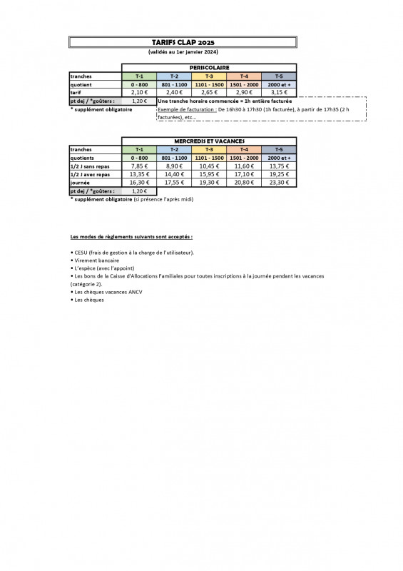 Possibilité d'utiliser des bons CAF (pour les vacances scolaires, pour les inscriptions à la journée). Les chèques
